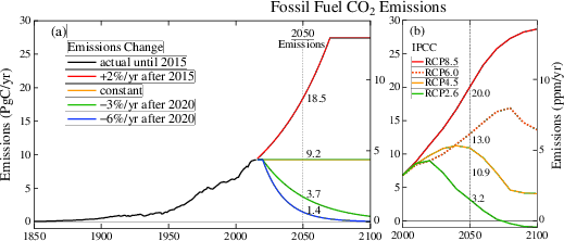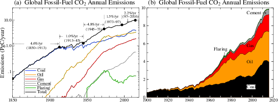 Data: (a), (b) (1850-2014 CDIAC & 2015-2016 BP, last update 2017/11/01 to divide at 1973)