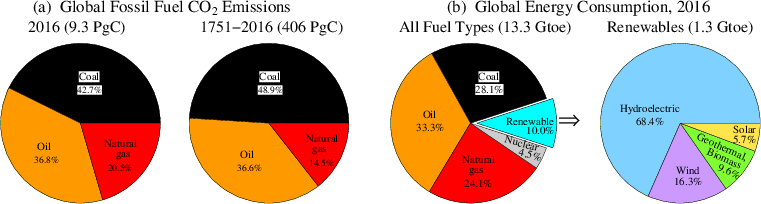 Note: The emission numbers above the pies in the paper included cement production and gas flaring. Here they are only the sums of coal, oil and gas.