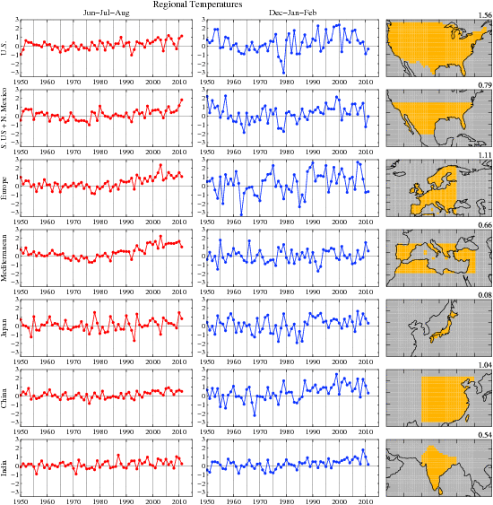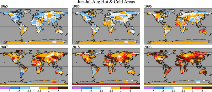 Figure 3/6. Jun-Jul-Aug surface temperature anomalies in units of the local 1951-1980 standard deviation.