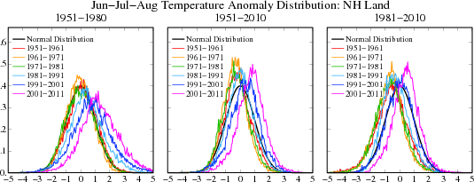 Figure 9. Frequency of occurrence (y-axis) of local temperature anomalies divided by local standard deviation (x-axis) obtained by binning all local results for 11-year periods into 0.05 frequency intervals. Area under each curve is unity. Standard deviations are for the indicated base periods.