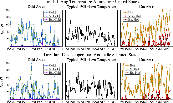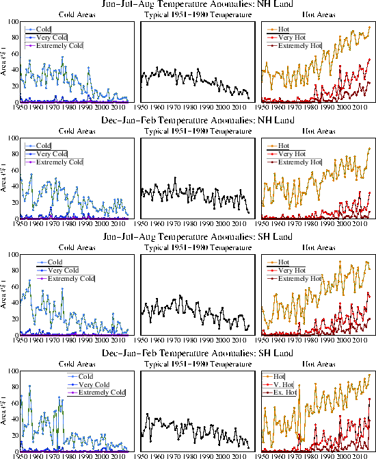 Figure 5. Area covered by temperature anomalies in the categories defined as hot (> 0.43σ), very hot (> 2σ), and extremely hot (> 3σ)