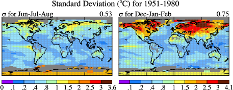 Figure 2 Simplified. Standard deviation of local Jun-Jul-Aug (left) and Dec-Jan-Feb (right) mean surface temperature for 30-year-period 1951-1980.