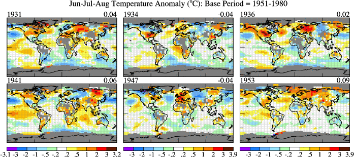 Figure S1. Jun-Jul-Aug surface temperature anomalies in 1931, 1934, 1936, 1941, 1947, 1953. Number on upper right is the global mean (average over all area with data).