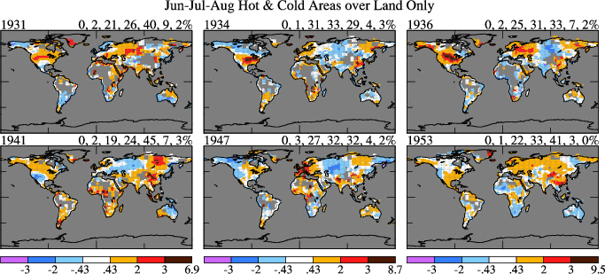 Figure S2. Jun-Jul-Aug surface temperature anomalies over land in 1931, 1934, 1936, 1941, 1947, 1953 relative to 1951-1980 mean temperature in unit of the local 1951-1980 standard deviation of temperature. Numbers above each map are the percent of surface area covered by each category in the color bar.
