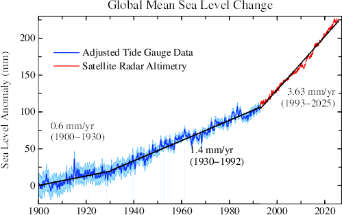 Satellites began to measure sea level precisely in 1993. Since then sea level has been rising about 3.6 mm/year. This rate is equal to just over one foot per century. The impact of such sea level change is substantial, yet the concern is that far greater sea level rise will occur this century if the major ice sheets disintegrate.