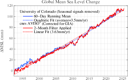 Global sea level change measured by TOPEX satellite (1992-2001), Jason-1 (2002-mid 2008), Jason-2 (mid 2008-2015), Jason-3 (2016-2020) and Sentinel-6 MF (2022-2025). Data source: University of Colorado at Boulder (data through March 7, 2025) and AVISO (data through November 11, 2025)
