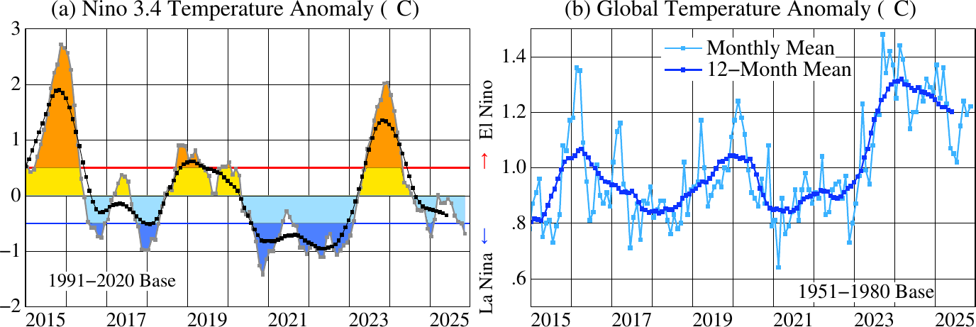 Comparison of El Nino/La Nina phase and the global mean temperature change. Figure also available in PDF (Updated on 2025/12/09, now with GHCN v4 and ERSST v5)