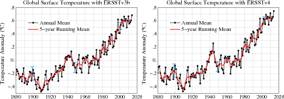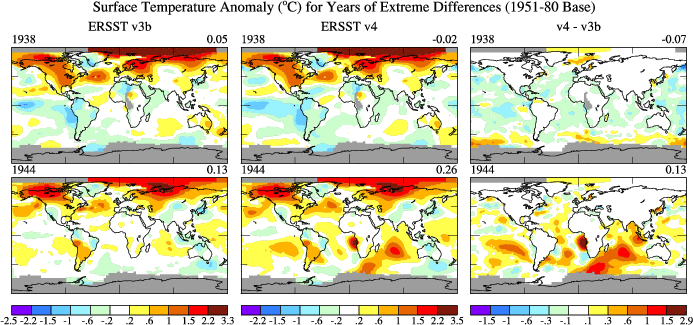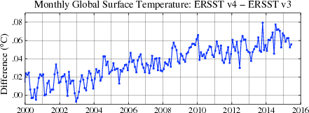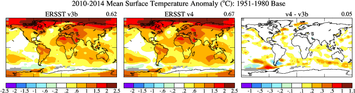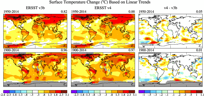 According to a NOAA page "Major improvements include updated and substantially more complete input data from the ICOADS Release 2.5, revised Empirical Orthogonal Teleconnections (EOTs) and EOT acceptance criterion, updated sea surface temperature (SST) quality control procedures, revised SST anomaly (SSTA) evaluation methods, revised low-frequency data filing in data sparse regions using nearby available observations, updated bias adjustments of ship SSTs using Hadley Nighttime Marine Air Temperature version 2 (HadNMAT2), and buoy SST bias adjustments not previously made in v3b."