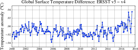 The difference in the monthly mean global surface temperature using ERSST v5 and v4 for 2000-present. Figure in