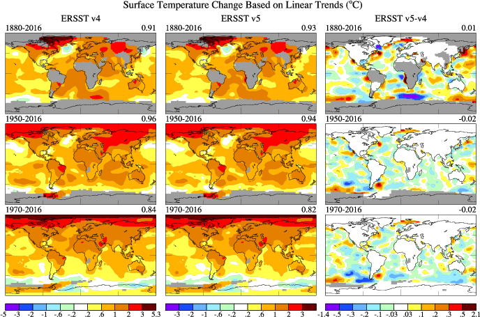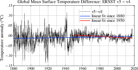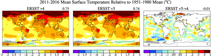 The difference in the monthly mean global surface temperature using ERSST v5 and v4. Figure in