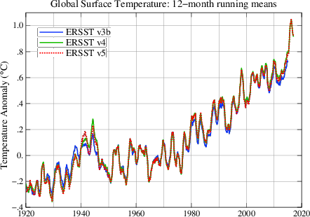 Comparison of the 12-month running means of the global surface temperature using ERSST v5 to v3b and v4. Figure in