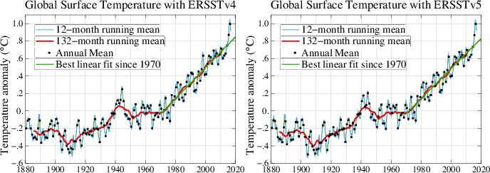 12-month and 132-month running mean global surface temperature using ERSST v4 and v5. Figure in