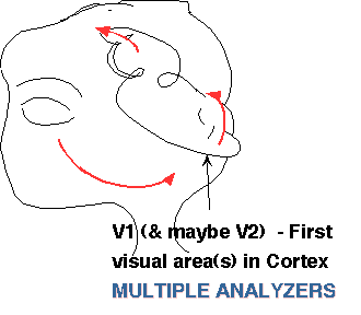 The likely brain substrate (in red below) for the multiple analyzers is area V1, the lowest visual area in cortex, and perhaps V2. This leaves a lot of visual cortex (in green below) to be modeled by the simple decision rule. It is as if near-threshold experiments made most of the visual brain transparent, allowing us to "see" the action of a relatively low level (the multiple analyzers). For more discussion see Graham 1989a and Graham 1992 (full text).