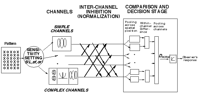 Next, for completeness sake, is a sketch of our full current model, including the decision stage (which must represent all of higher cortex) as well as the simple and complex channels and the normalization (inter-channel inhibition) process.