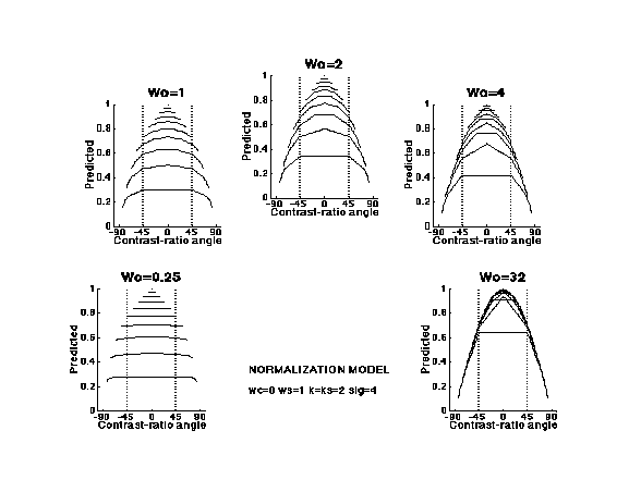 Quantitative predictions from our equations are shown in the next figure. (The panels are distinguished by the weight placed on the responses of the "other channels" in the denominator of the normalization equation. The greater that weight, the greater the normalization effect.) The predictions from this normalization model fit results from individual experiments very well, with typical experimental results (e.g. those on the Constant-Difference-Series page) requiring compression about like that shown in the upper right of the diagram (Graham, Beck, and Sutter, 1992; Graham and Sutter, 1996; Graham and Sutter, 2000, Wolfson and Graham, in press 2004).