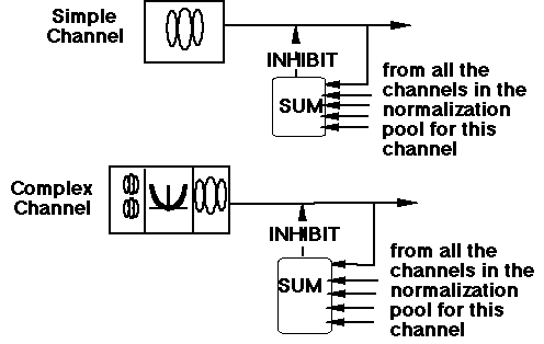 Below is an alternate diagram of the first part of our texture-segregation model, a diagram explicitly representing the normalization pools. The diagram represents the assumption that the inhibitory effects from all the members of the pool can be thought to summate in some fashion in their effect on the inhibited channel. ("Sum" does not necessarily imply linear summation and we consider a family of possible power-summation rules.) For normalization to predict our results (or indeed for it to have the functional properties ascribed to it more generally above) we need to assume that: